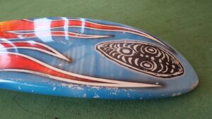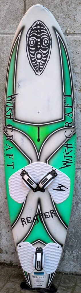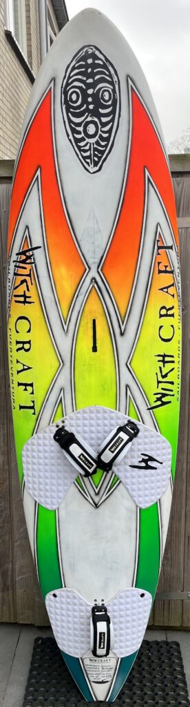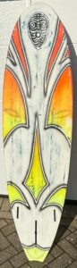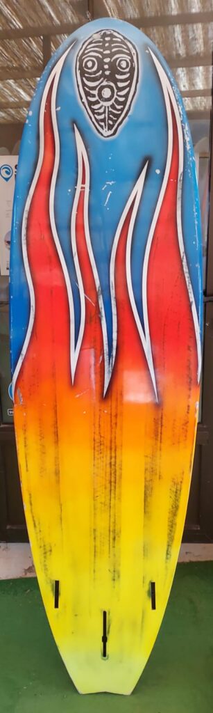 Good condition, all totally solid, structurally sound, no holes. Some superficial damage that has been touched up. Has been totally resprayed with new pads. Comes with fins and straps as usual.